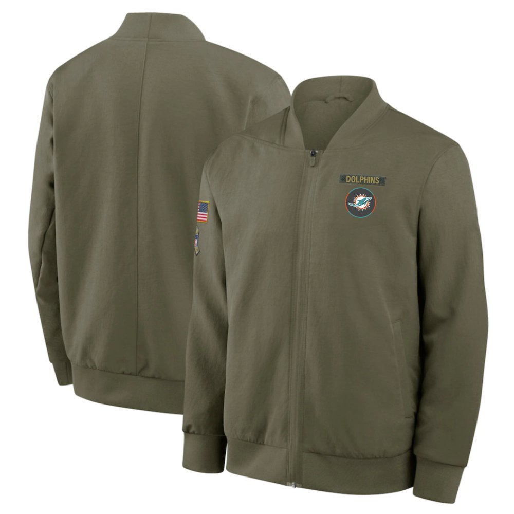 Men's Miami Dolphins Nike Olive 2025 Salute to Service Sideline Full-Zip Bomber Jacket
