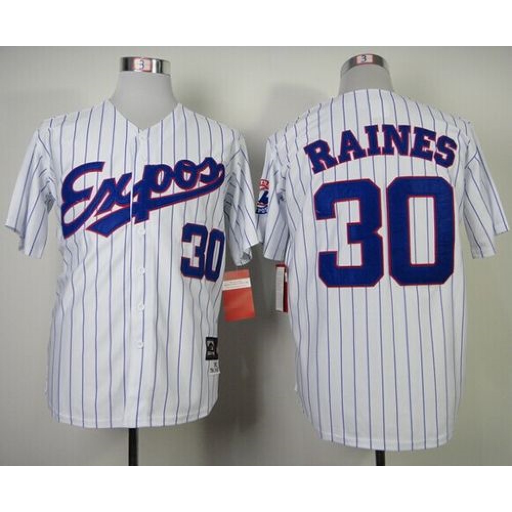 Mitchell and Ness 1982 Expos #30 Tim Raines White Blue Strip Stitched Throwback MLB Jersey