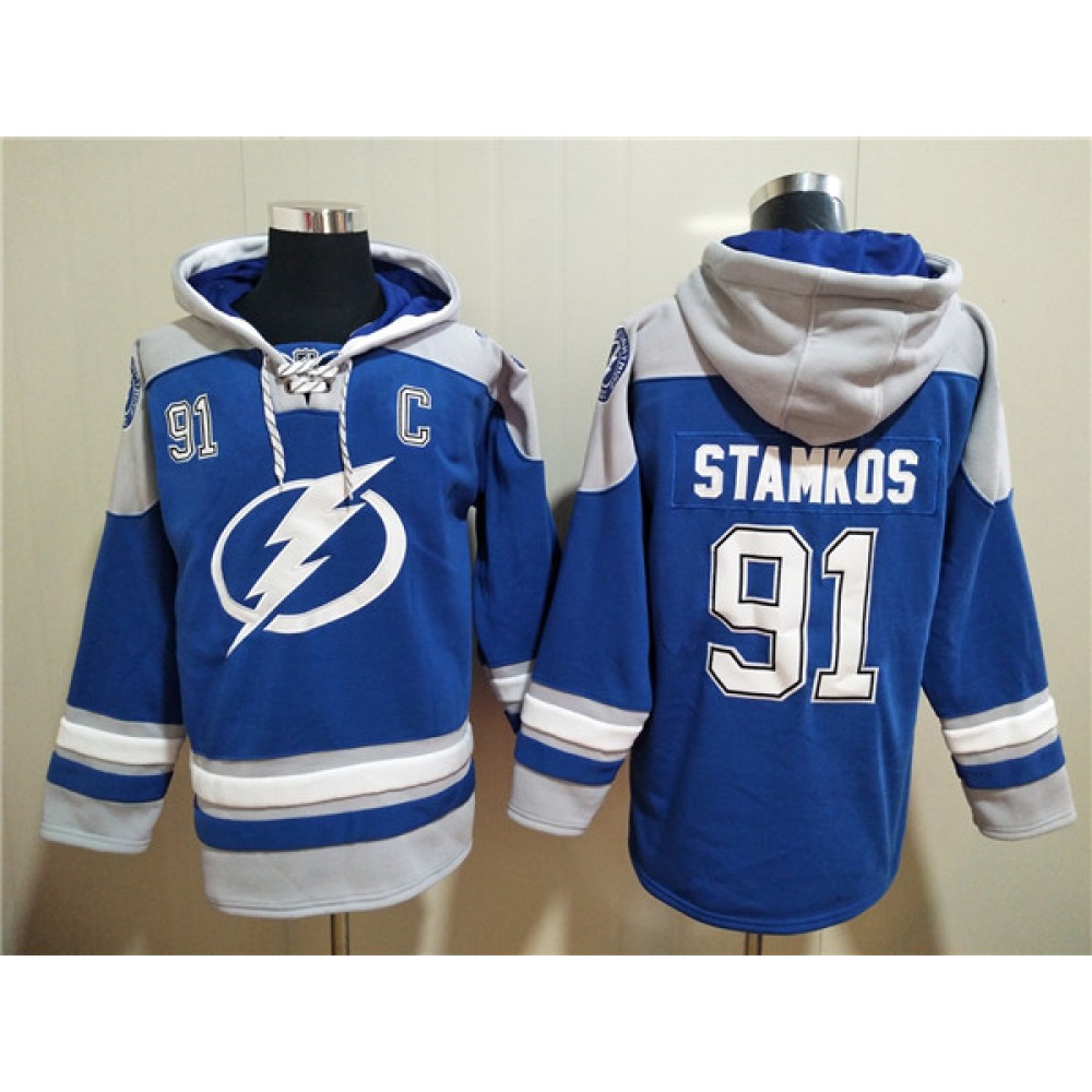 Men's Tampa Bay Lightning #91 Steven Stamkos Blue Ageless Must-Have Lace-Up Pullover Hoodie