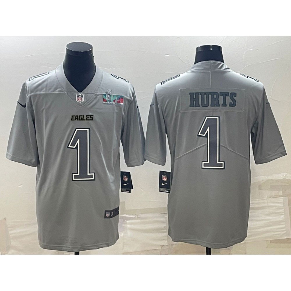 Men's Philadelphia Eagles #1 Jalen Hurts Gray Super Bowl LVII Patch Atmosphere Fashion Stitched Jersey