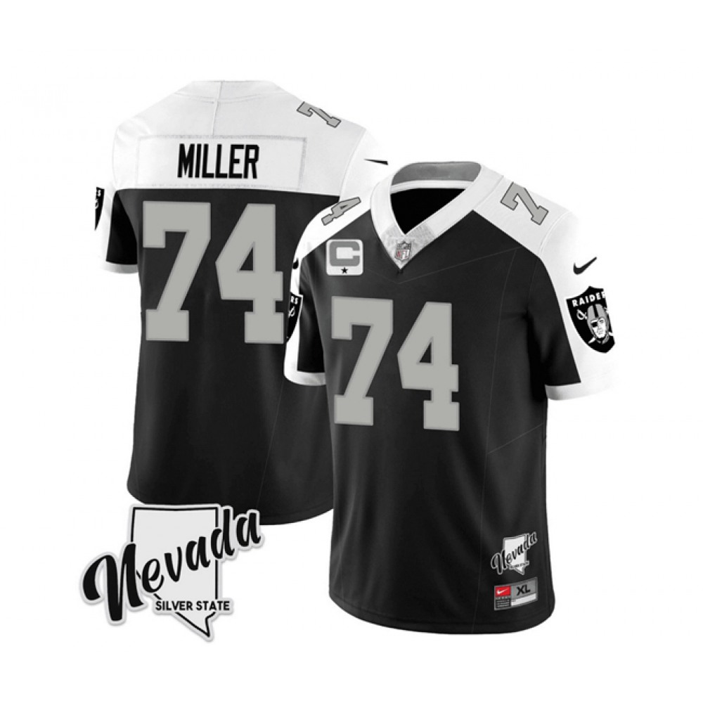 Men's Las Vegas Raiders #74 Kolton Miller Black/White 2023 F.U.S.E Nevada Silver Stat With 1-Star C patch Stitched Football Jersey