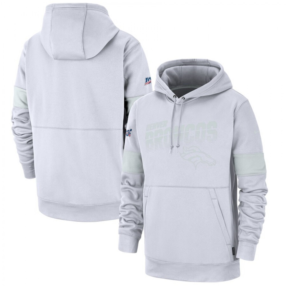 Men's Denver Broncos White 2019 100th Season Sideline Platinum Therma Pullover Hoodie