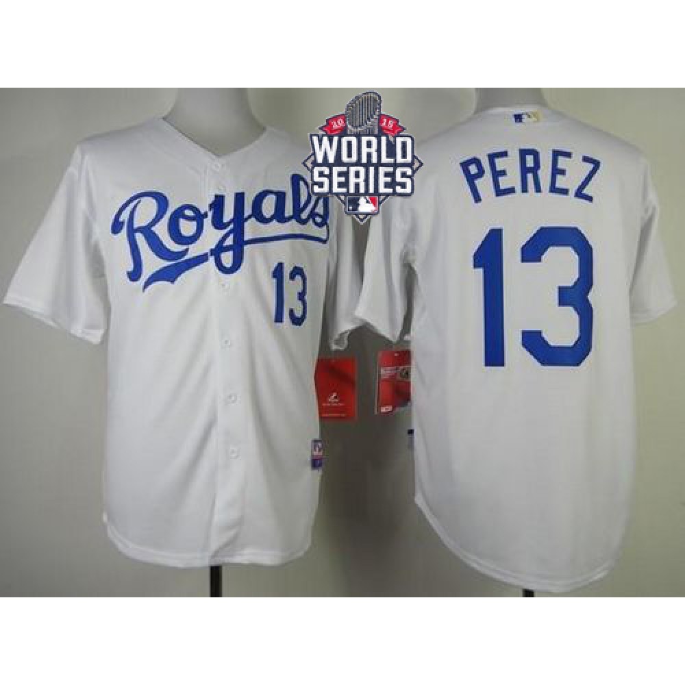 Royals #13 Salvador Perez White Cool Base W/2015 World Series Patch Stitched MLB Jersey