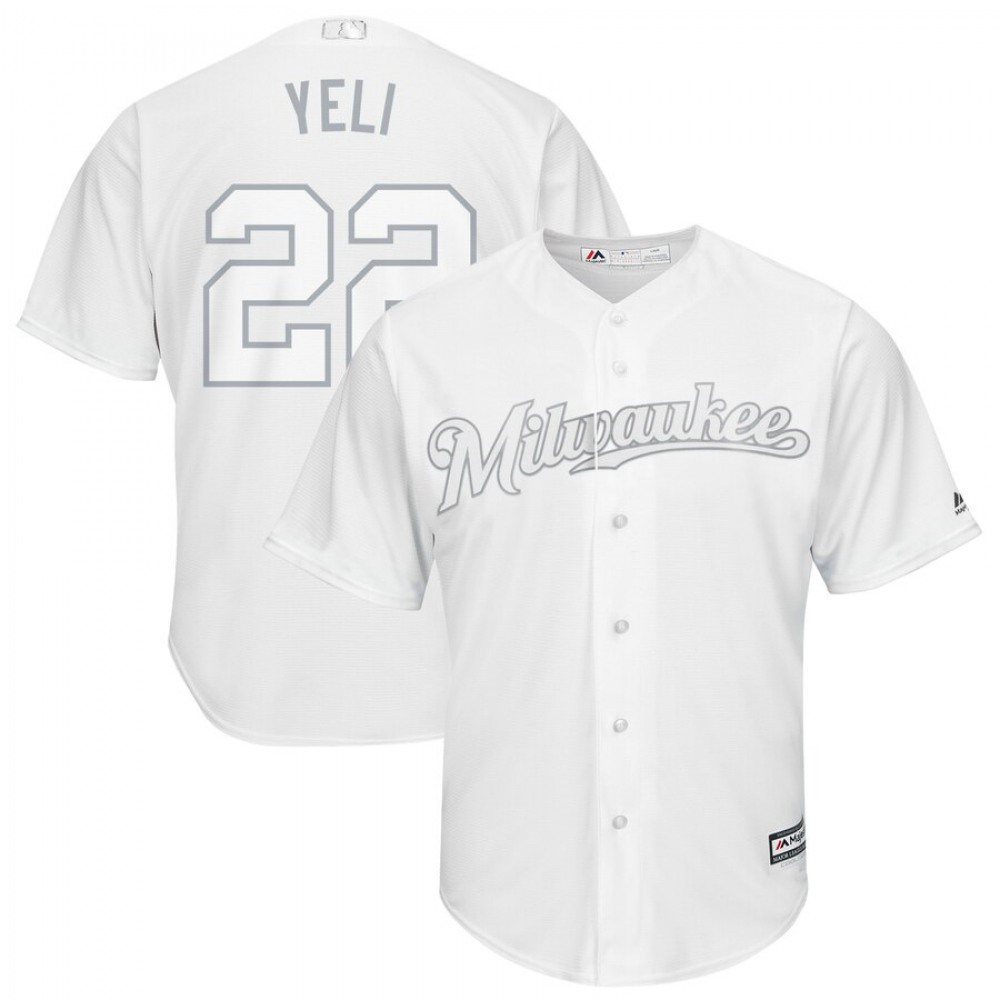 Men's Milwaukee Brewers #22 Christian Yelich "Yeli" White 2019 Players' Weekend Pick-A-Player Replica Roster Stitched MLB Jersey