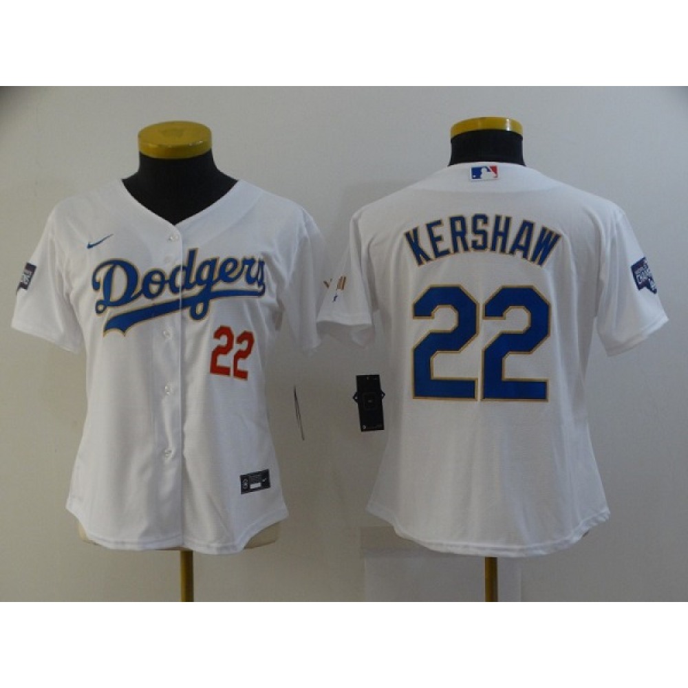 Women's Los Angeles Dodgers #22 Clayton Kershaw White Gold Championship Cool Base Stitched Jersey(Run Small)