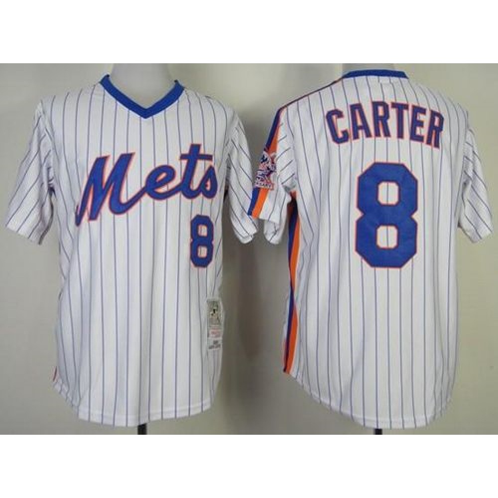 Mitchell and Ness Mets #8 Gary Carter Stitched White Blue Strip Throwback MLB Jersey