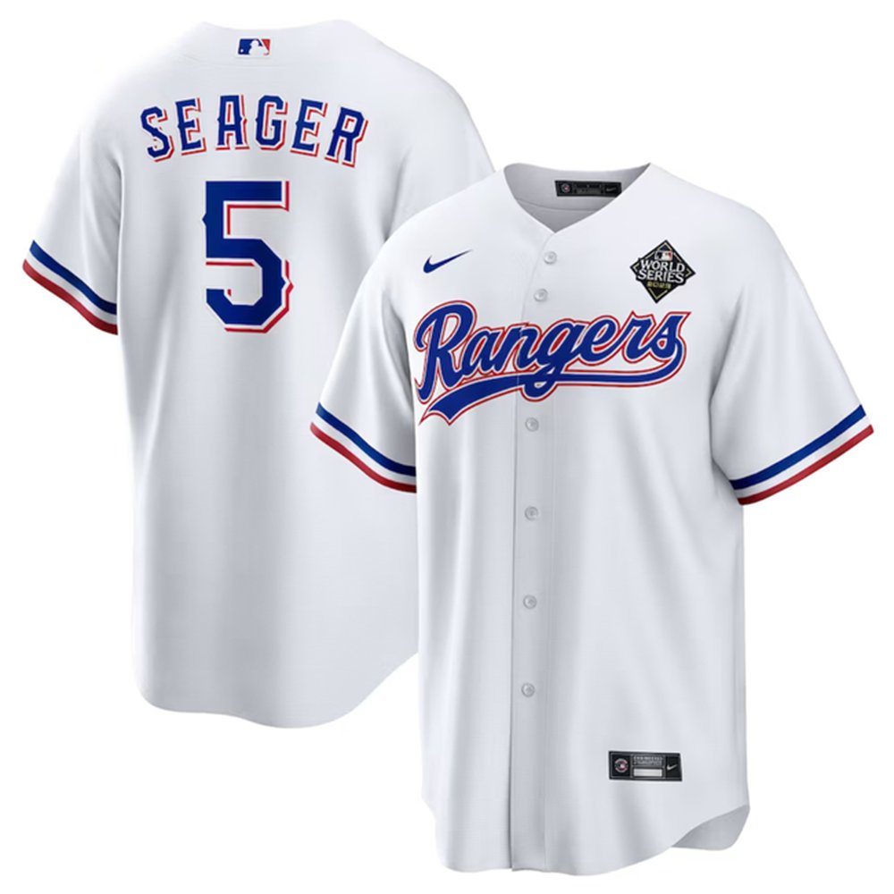 Men's Texas Rangers #5 Corey Seager White 2023 World Series Stitched Baseball Jersey