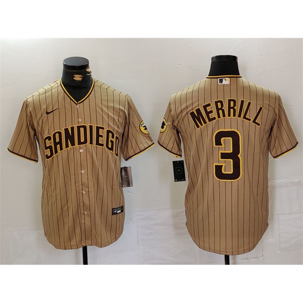 Men's San Diego Padres #3 Jackson Merrill Tan Cool Base Stitched Baseball Jersey