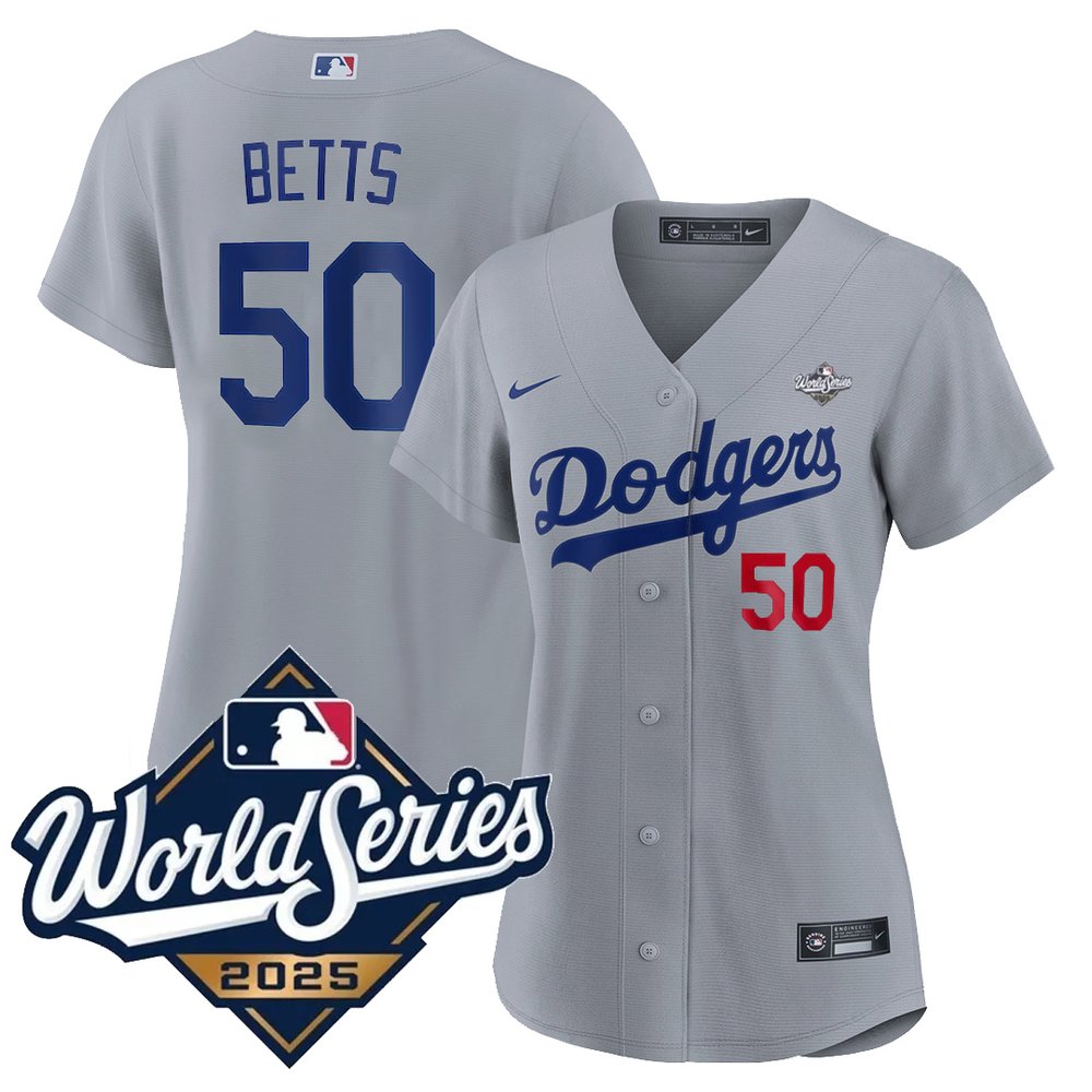 Women's Los Angeles Dodgers #50 Mookie Betts Nike Gray 2025 World Series Home Limited Jersey